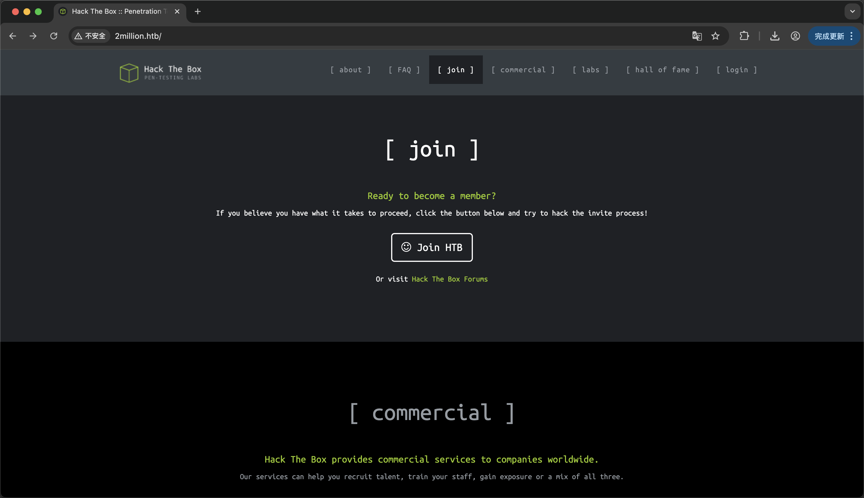 对该虚拟机进行端口扫描 并没有特别之处 正常访问80端口进行下一步搜集 域名为http://2million.htb/