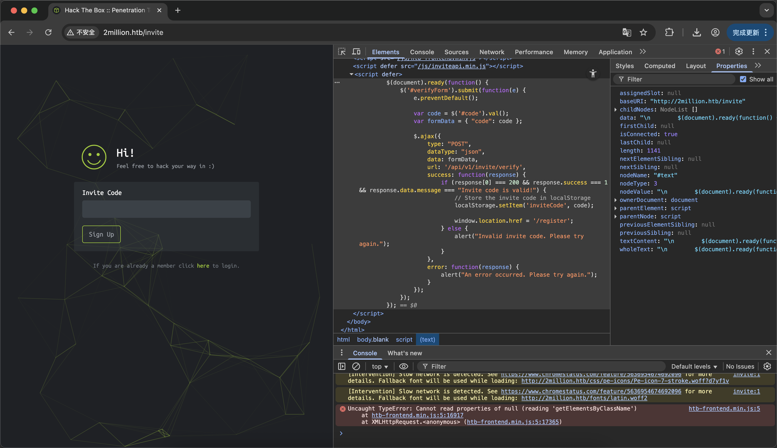 没想到稍微看一下源代码就震撼到我了 这个token居然可能存在本地 之后通过Sign Up按钮点击访问api后 在浏览器network工具里找到了invite.js的混淆代码 当然直接去sources里面看也行 通过de4js反混淆得到源代码