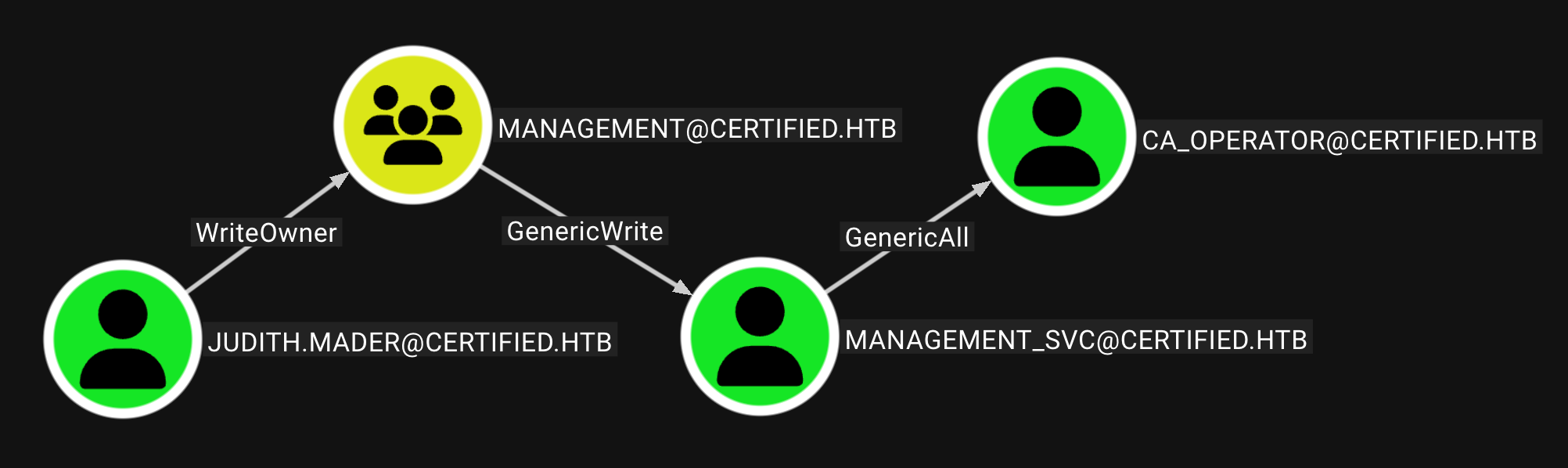Certified is a medium-difficulty Windows machine designed around an assumed breach scenario, where credentials for a low-privileged user are provided. To gain access to the management_svc account, ACLs (Access Control Lists) over privileged objects are enumerated leading us to discover that judith.mader which has the write owner ACL over management group, management group has GenericWrite over the management_svc account where we can finally authenticate to the target using WinRM obtaining the user flag. Exploitation of the Active Directory Certificate Service (ADCS) is required to get access to the Administrator account by abusing shadow credentials and ESC9.